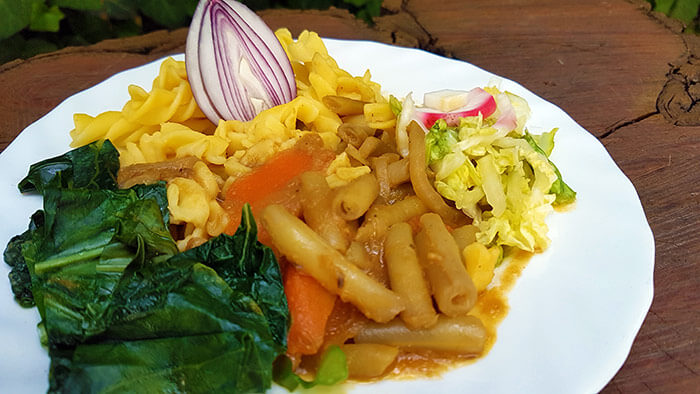 Tehetjük főtt kukorica vagy rizstésztához a hirtelen sütött, vagy pirított kissé nyers zöldségeket, amelyekhez fehérje fogásként babsalátát, csicseriborsó salátát vagy lencse salátát adhatunk, hogy ne legyünk éhesek. A bab, csicseriborsó vagy lencse salátába a főtt növényi fehérjéhez nyers zöldségeket keverünk pl. felkockázott kimagozott uborka, piros retek, sör retek, lilahagyma, újhagyma, póréhagyma….