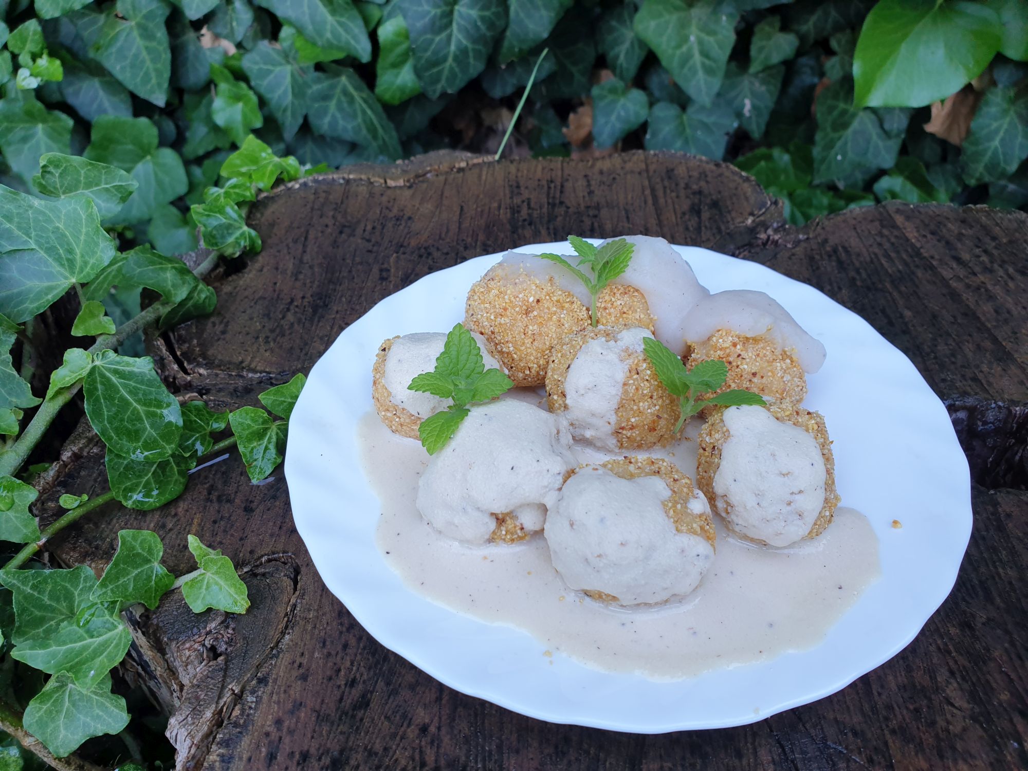 A kukoricadarás gombócokat az édes-savanyú tofu tejföllel leöntöm tálaláskor.