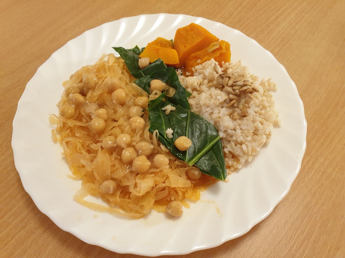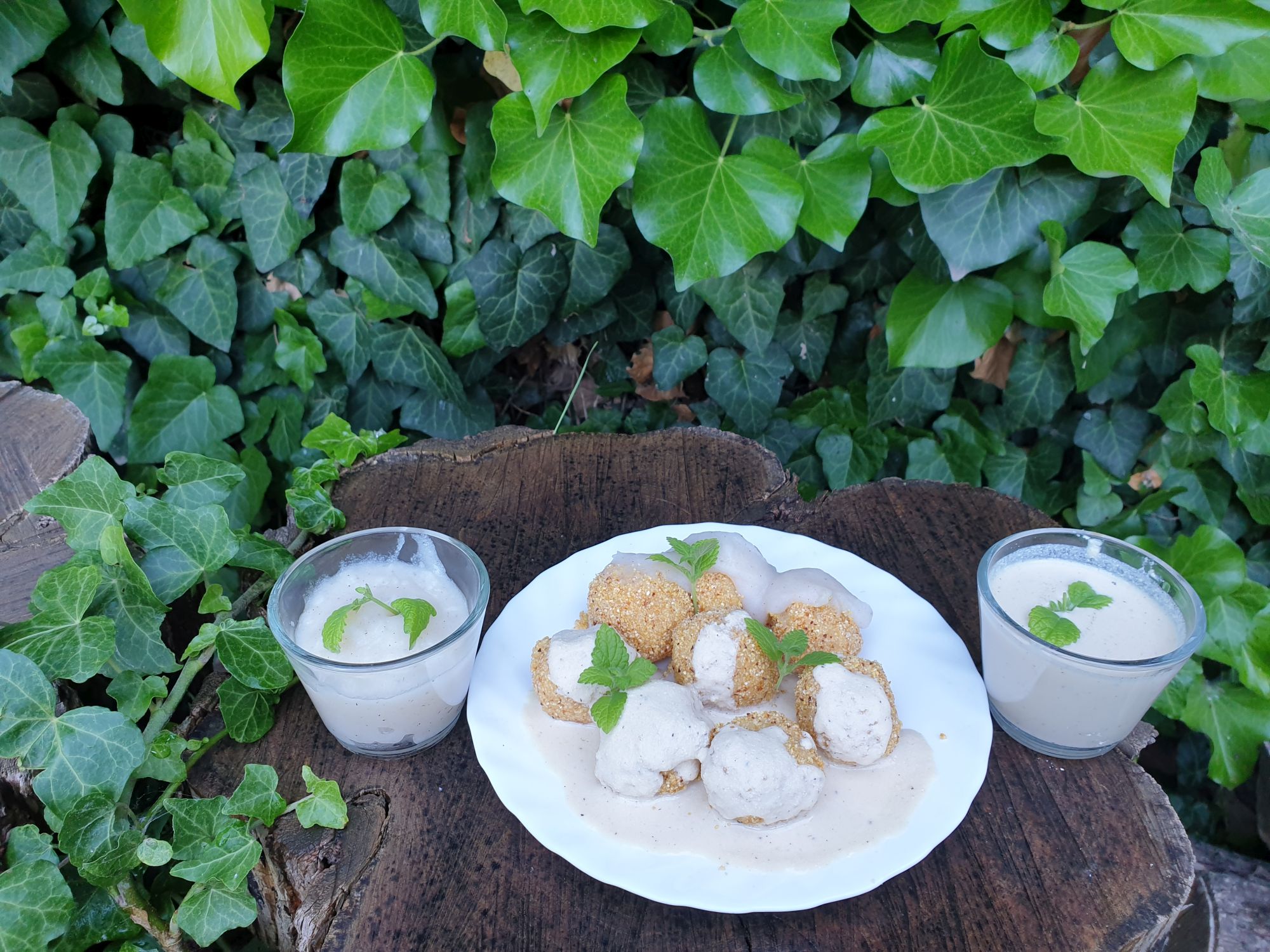 A köleses karfiol köret (úgy néz ki mint egy burgonya püré) falafellel (csicseriborsó fasírttal), zöldségtempúrával és piros hónapos retek salátával szintén remek főfogás. Itt sós variációban van elkészítve a köles, ami szintén jó átvezető étel az átszokáshoz, mivel emlékeztet a régi finomságokra.